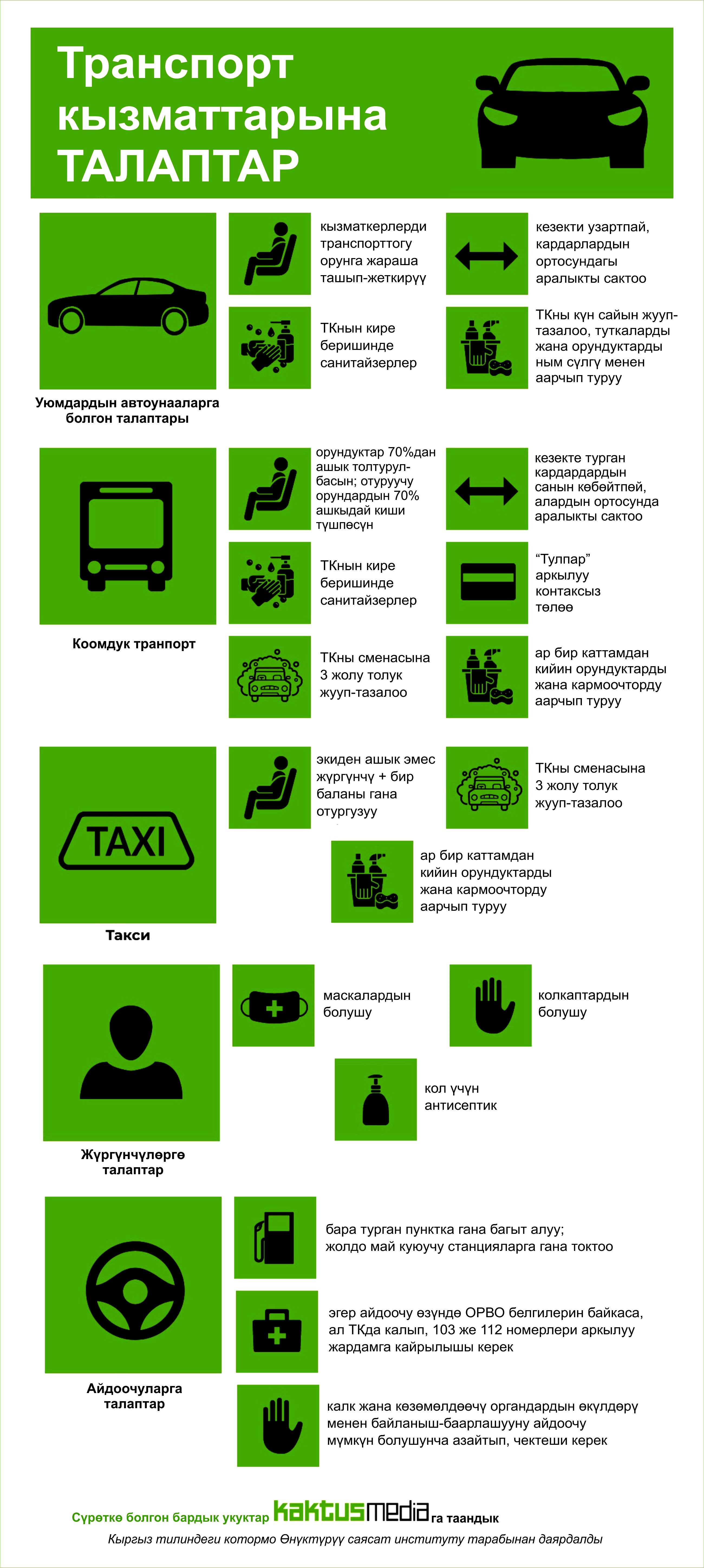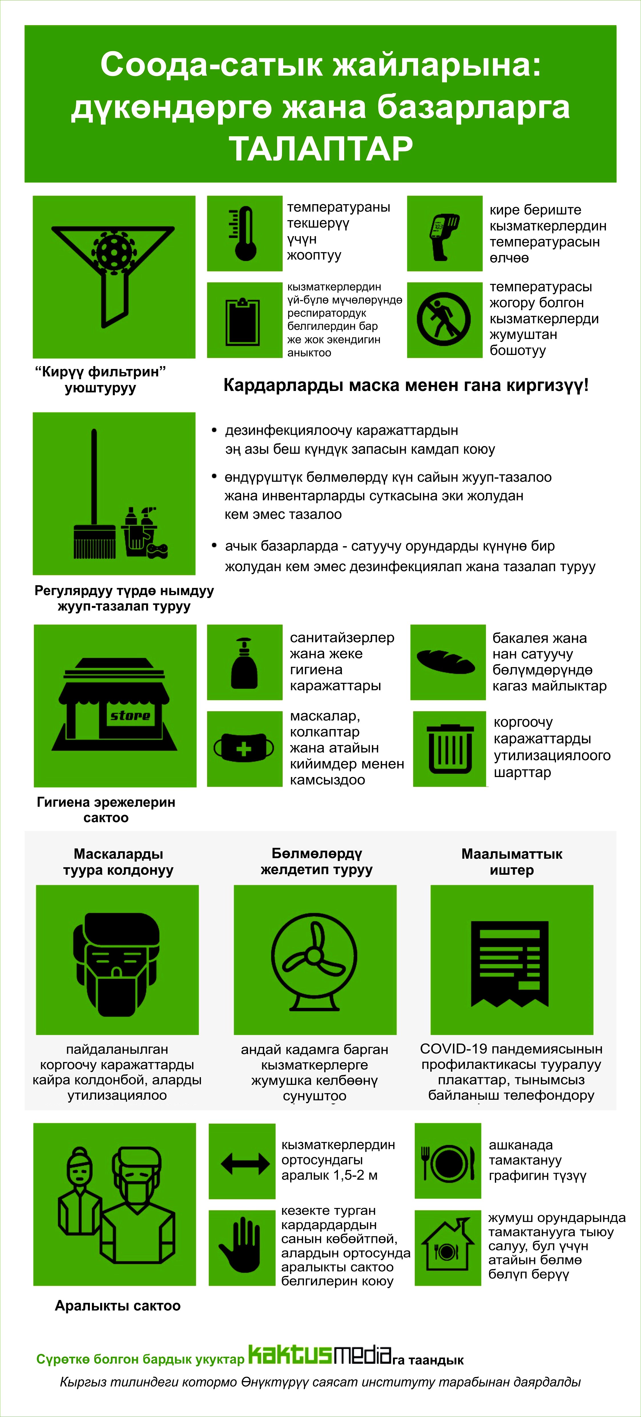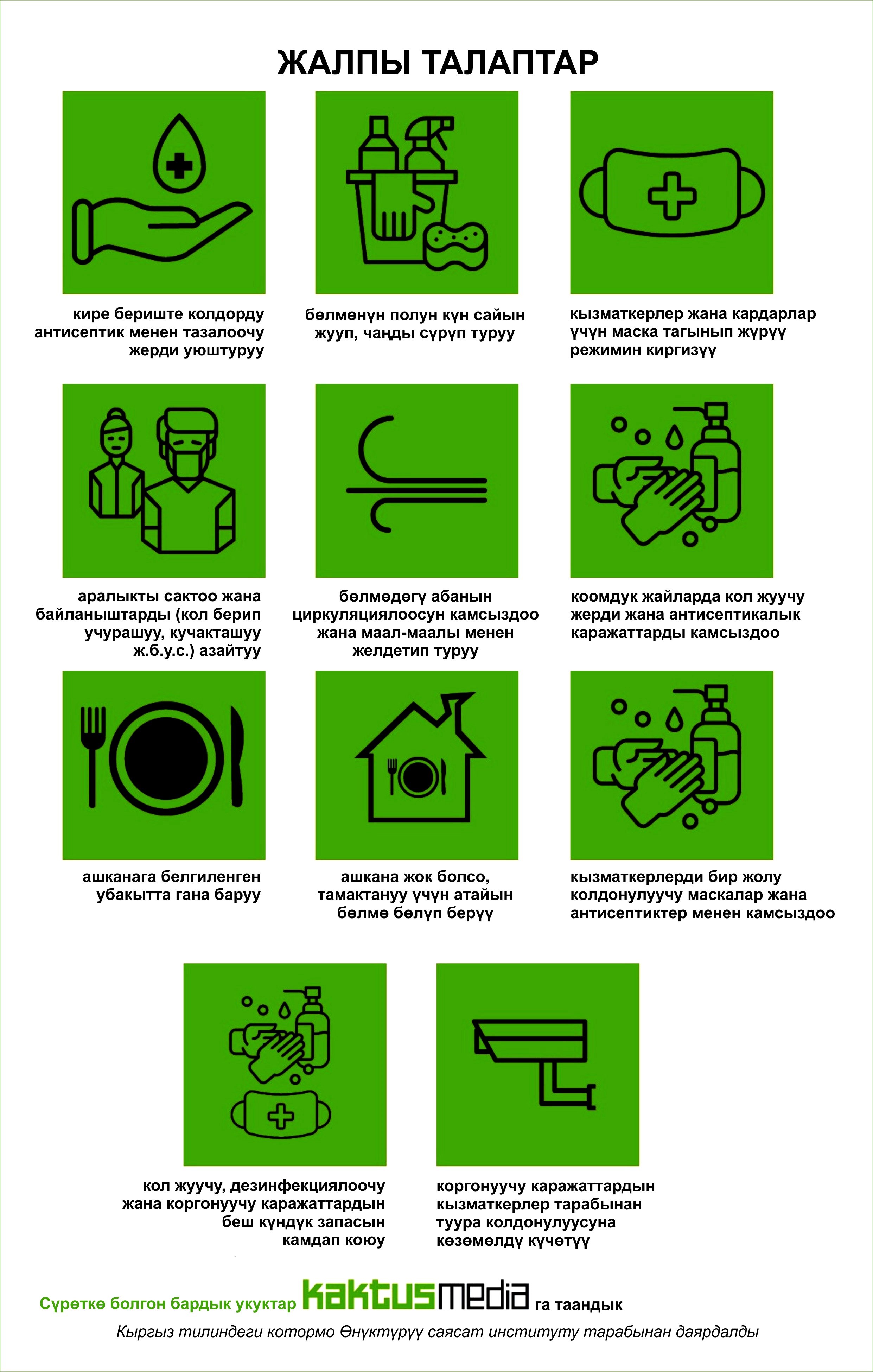 Ишмердигин жүргүзүүгө уруксат берилген бардык ишкерлер КР Өкмөтү тарабынан 2020-жылдын 11-майында бекитилген №244-токтомунда көрсөтүлгөн санитардык нормаларды бекем сактоого тийиш.
